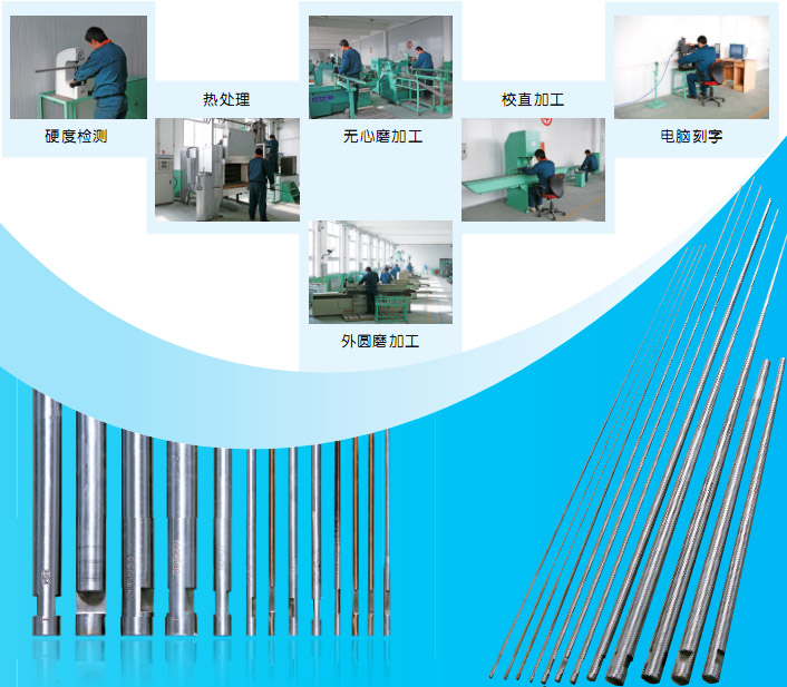 我廠以先進的生產工藝配套生產漁竿、高爾夫球桿、登山杖、滑雪桿、箭桿等一系列模具,我們以嚴格的檢驗流程,用先進的檢測設備,來控制每支合格產品的出廠。所產模具技術要求均保證到:表面硬度HRC42—52(可按客戶要求定),表面粗糙度 ,徑向公差均為±0.015mm,直線度0.10mm/1000mm 以內。
